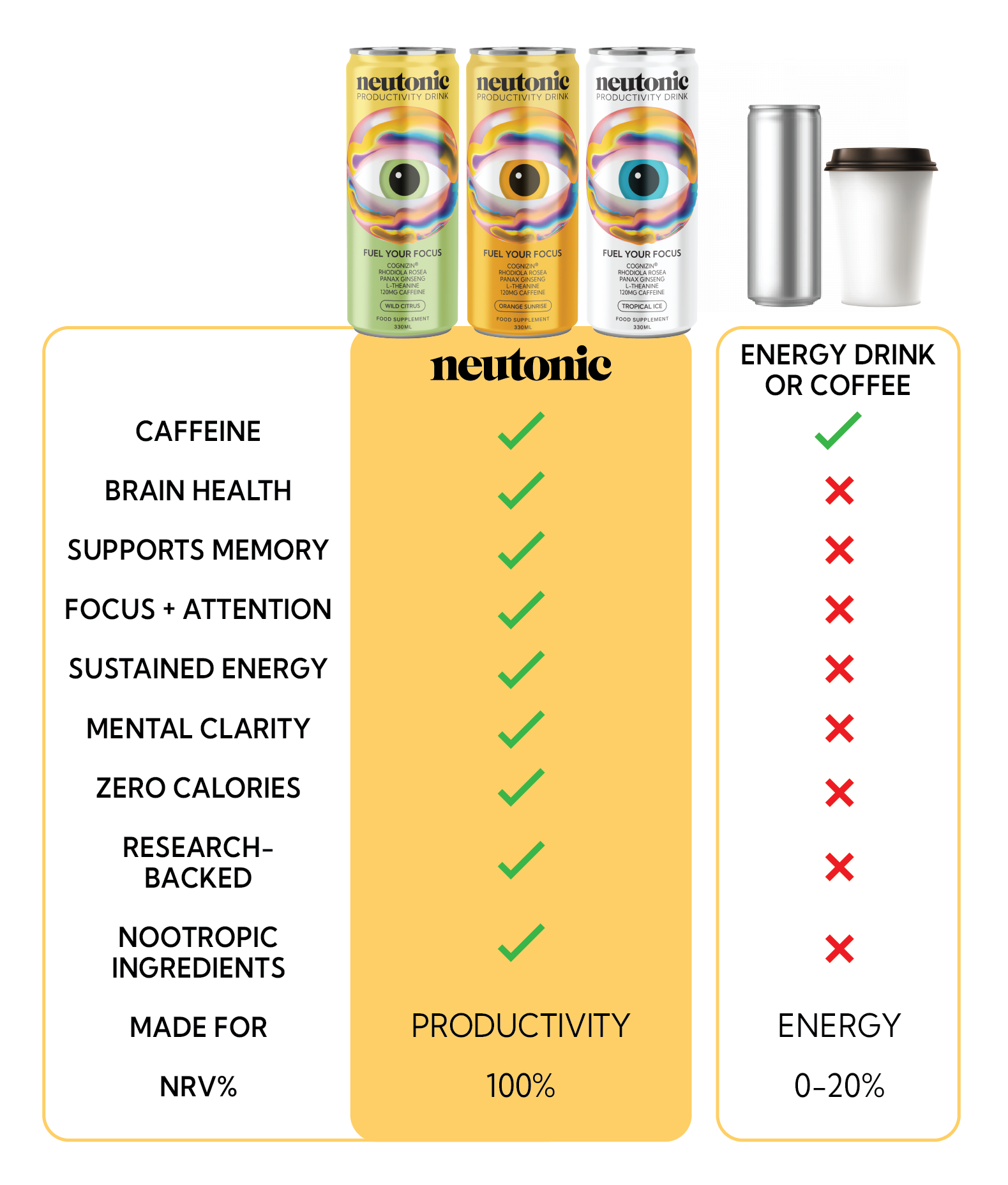 Drinking Neutonic feels a bit like enjoying your favorite energy drink, but with a bonus. It tastes really great and has a similar flavour profile to leading energy drinks. But as you sip it, you'll start feeling more focused and ready to get things done. It's like having a secret weapon to help you stay on top of your game throughout the day. Neutonic isn't just a drink; it's your great tasting path to enhanced focus and productivity.